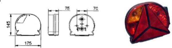 fanale posteriore dx con catadiottro triangolare (posizione, stop, direzione) – L=mm. 175, H=mm. 145, P=mm. 75, interasse fori mm. 70